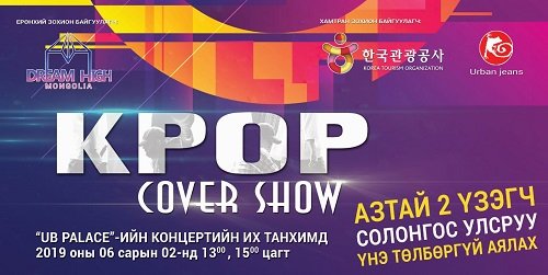 Дэлхийн урлаг соёлын салбарт Ази, тэр дундаа Солонгос уран бүтээлчид хүчээ авч байгаа энэ цаг үед "Dream High Mongolia"-гийн хамт олон цаг үеэ олсон тоглолтыг зохион байгуулахаар болоод байна. Энэхүү тоглолт нь "Kpop cover concert" юм. Тоглолтод хүүхэд, залуучуудын хайртай хамтлаг дуучдынхаа дууг ковер хийж, нэгэн өдрийг “К поп” хөгжмөөр амьсгалан өнгөрөөнө. Мөн тоглолтын зочноор монголын дуу хөгжмийн ертөнцөд өөрсдийн байр сууриа олоод байгаа дуучин Гантогоо, The Saway, Honeymoon, Жижгээ, Цогтоо, жүжигчин зэрэг уран бүтээлчид оролцоно. Тоглолт ирэх 6-р дугаар сарын 2-нд "UB Palace"-ийн концертийн их танхимд хоёр удаа болно. Энэхүү тоглолтонд ирсэн сонсогч та “К поп” оддын тоглолтыг амьдаар нь үзсэн мэт сэтгэгдлийн авна гэдэгт итгэлтэй байна. Ингээд “К поп” хөгжмийг сонсдог, хайрладаг хүүхэд, залуус та бүхнийг энэхүү тоглолтод урьж байна.